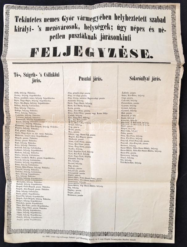 1845 Tekintetes nemes Győr vármegyében helyheztetett szabad királyi- 's mezővárosok, helységek; úgy népes és népetlen pusztáknak járásonkinti feljegyzése. Nagyméretű nyomtatvány. 38x50 cm