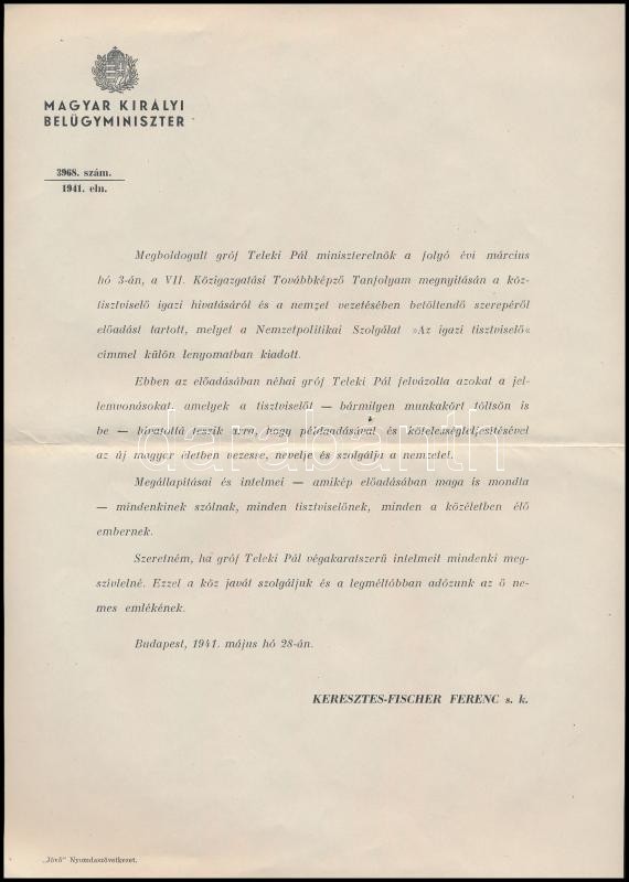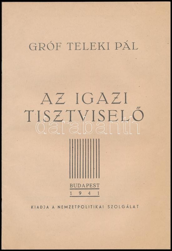Teleki Pál: Az igazi tisztviselő. A magyar közigazgatás LIX. évf. 12. sz. különlenyomata. Bp., 1941, Nemzetpolitikai Szolgálat, ("Jövő" Nyomdaszövetkezet-ny.), 30 p. Kiadói papírkötés. + Hozzá Keresztes Fischer Ferenc belügyminiszter vásárlásra ösztönző levele