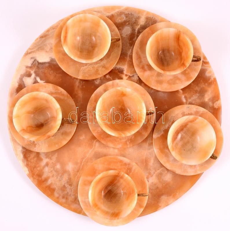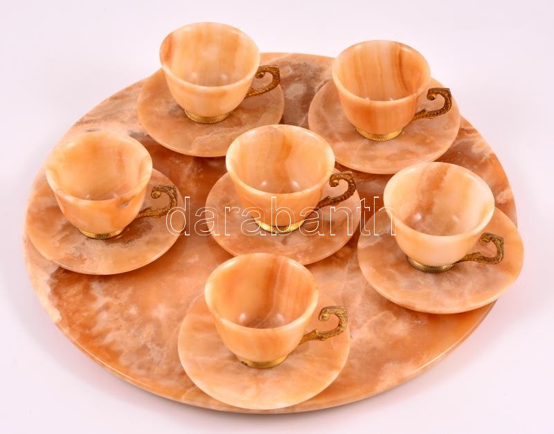 Beschreibung: Dekoratív alabástrom készlet: kínálótál, csésze+alj, összesen 7 db, apró kopásokkal