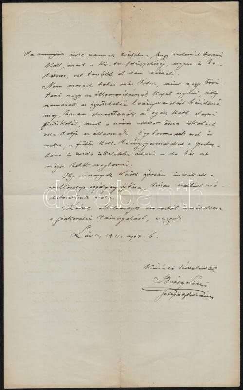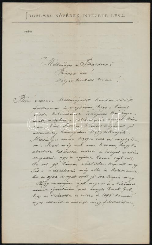 1911 Léva, Báthy László (1861-1933) lévai prépost, későbbi esztergomi kanonok saját kézzel írt és aláírt kétoldalas levele a lévai (Felvidék) Irgalmas Nővérek Intézete vezetőjeként Kohl Medárd püspök, hercegprímási titkárnak, amelyben anyagi támogatást kér az intézet kibővítéséhez, különben kénytelen a katolikus lánygyermekeket protestáns és zsidó iskolákba küldeni