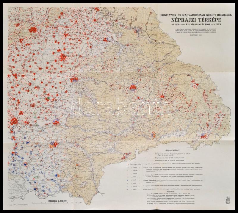 1940 Erdélynek és Magyarország keleti részeinek néprajzi térképe az 1930-1939. évi népszámlálás alapján, 1:75.000. Bp., M. Kir. Honvéd Térképészeti Intézet, 70x62 cm