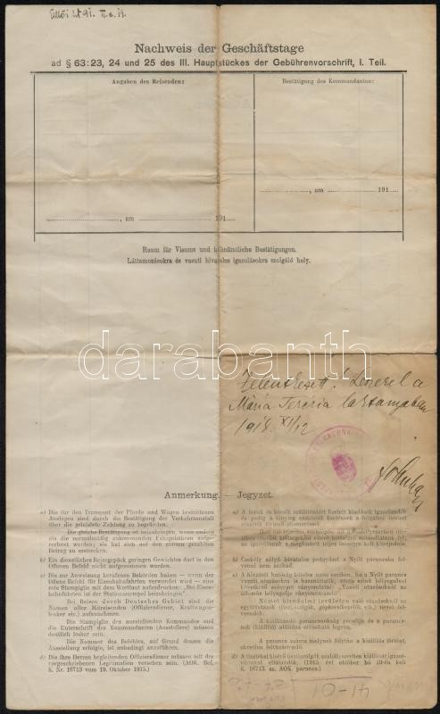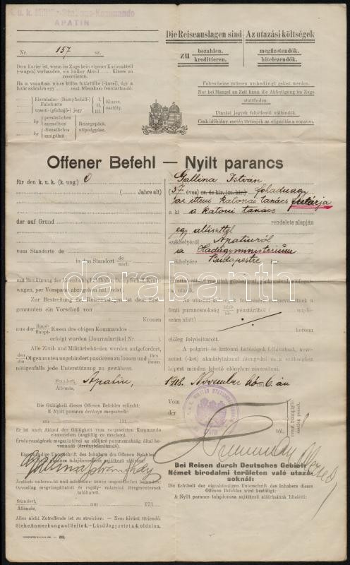Beschreibung: 1918 Apatin, Nyílt parancs az apatini (Délvidék) katonai tanács futára számára a budapesti hadügyminisztériumba utazáshoz, aláírással, pecsételve