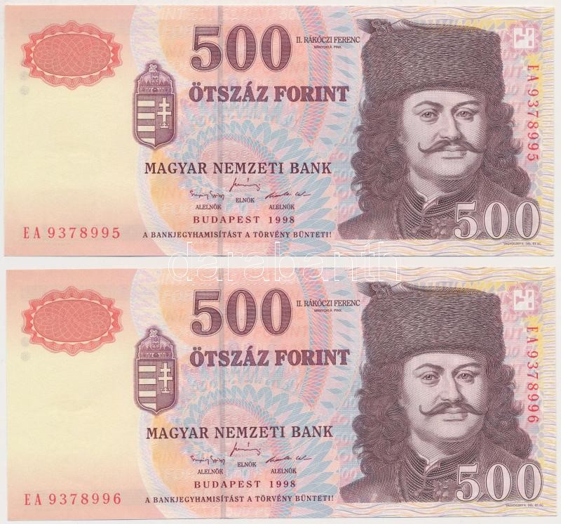 1998. 500Ft "EA" (2x) sorszámkövetők T:II https://www.darabanth.com/de/341-Fernauktion/341.0/Numismatik/Ungarische-Banknoten~2000007/1998-500Ft-EA-2x-sorszamkovetok-TII~II1918830