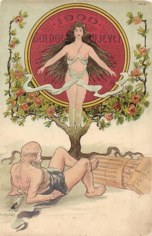 Beschreibung: 1900 Boldog Újévet! / Gently erotic nude lady, New Year greeting Art Nouveau postcard, litho s: J. v. Kulas