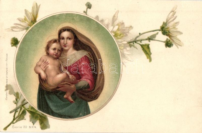Beschreibung: Religious greeting art postcard. Virgin Mary and baby Jesus. Wezel & Naumann Serie 20. No. 4. floral, litho