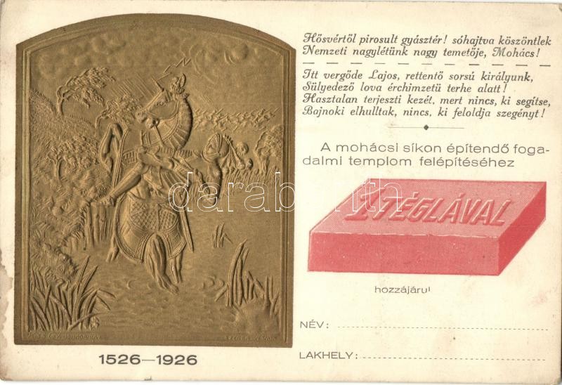 1526-1926 Mohácsi vész 400. évfordulójának emléklaplapja; Fogadalmi te... https://www.darabanth.com/de/342-Fernauktion/342.0/Ansichtskarten/Militaria~2000054/1526-1926-Mohacsi-vesz-400-evfordulojanak-emleklaplapja-Fogadalmi-templom-felepitesehez-~II1929708
