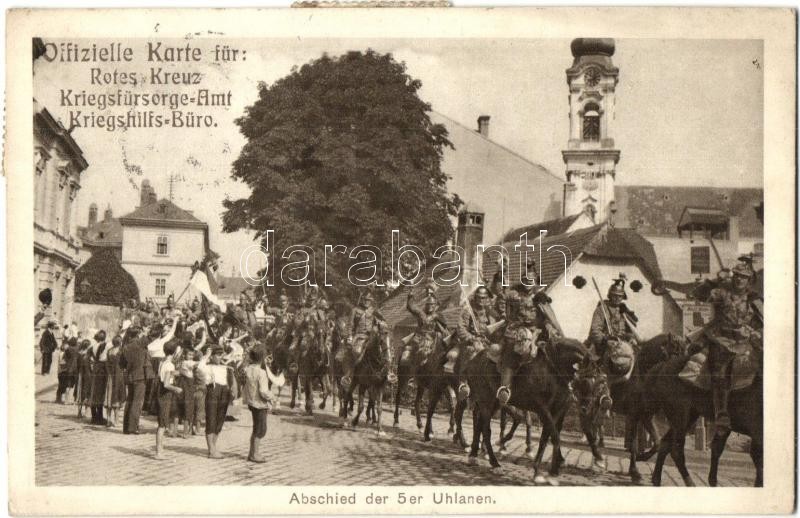 Abschied der 5er Uhlanen. Rotes Kreuz, Kriegshilfsbüro / WWI Austro-Hu... https://www.darabanth.com/de/342-Fernauktion/342.0/Ansichtskarten/Militaria~2000054/Abschied-der-5er-Uhlanen-Rotes-Kreuz-Kriegshilfsburo-WWI-Austro-Hungarian-KuK-military-fare~II1931486
