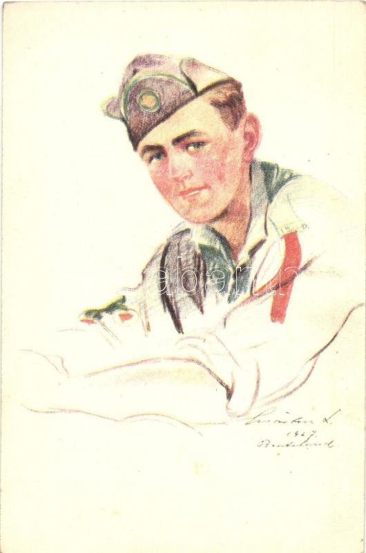 Beschreibung: 12 db RÉGI használatlan magyar cserkész motívumlap, Márton L. szignóval / 12 pre-1945 unused Hungarian scout art postcards, signed by Márton L.
