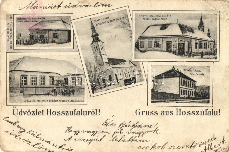 1903 Hosszúfalu, Satulung (Négyfalu, Sacele); Román Ortodox templom, Román iskola, Radu G. Aldia üzletei, télen. Steegmüller Phot. / Filiale G. Radu Aldea, Biserica St. Adormiri, Casele George Aldia, Pravalia Centrala Radu G. Aldea, Scola Rum. / Romanian Orthodox church, shops of Radu G. Aldea in winter (r)