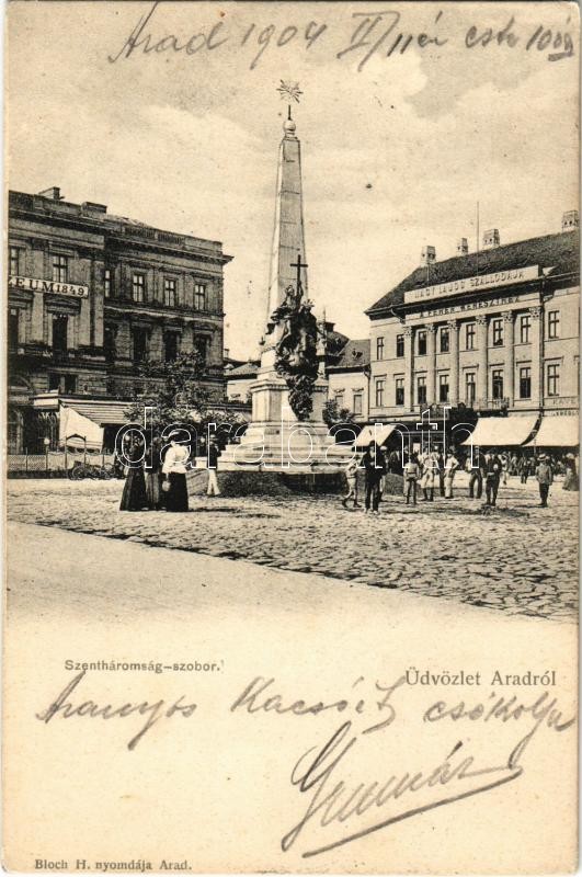1904 Arad, Szentháromság-szobor, Nagy Lajos szállodája Fehér Kereszth... https://www.darabanth.com/de/342-Fernauktion/342.0/Ansichtskarten/Siebenburgen~2000005/1904-Arad-Szentharomsag-szobor-Nagy-Lajos-szallodaja-Feher-Kereszthez-1848-49-es-Muzeum-B~II1930253