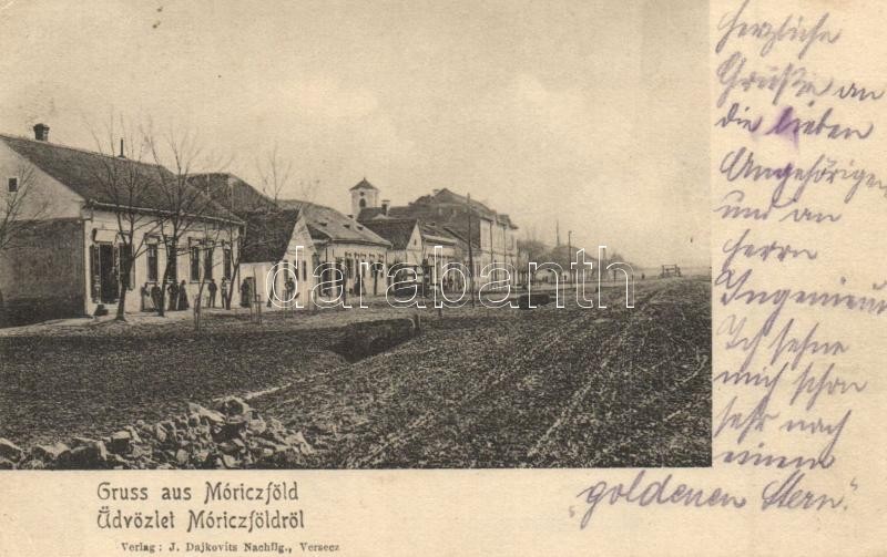 Beschreibung: 1907 Móricföld, Maureni; utcakép, üzletek. J. Dajkovits kiadása / street view, shops