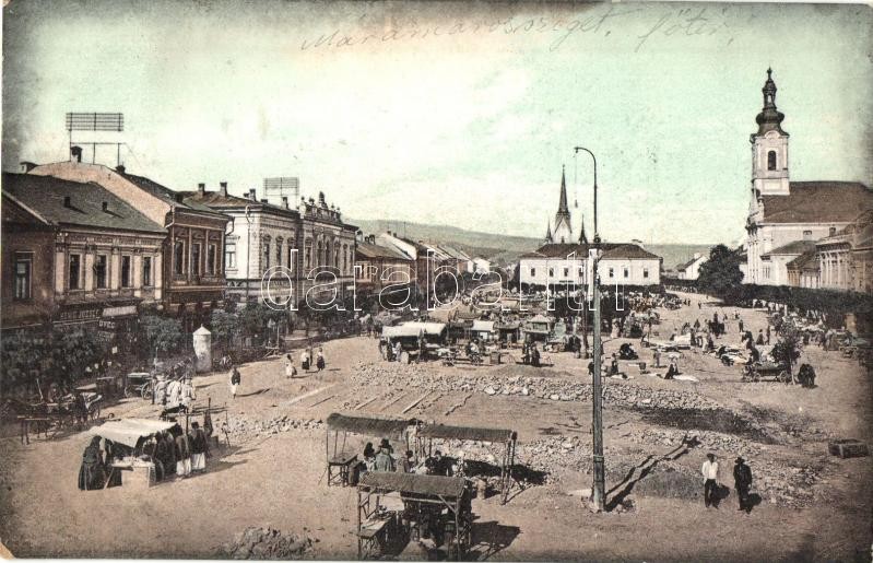 1912 Máramarossziget, Sighetu Marmatiei; Fő tér, piaci árusok, Honig József, Farkas Mór üzlete, Korona szálloda és kávéház, templomok. Kiadja Wizner és Dávid 9130a / main square, market vendors, shops, hotel and café, churches (EK)