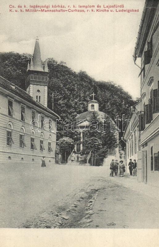 Beschreibung: Herkulesfürdő, Baile Herculane; Cs. és kir. legénységi kórház, Lajos-fürdő, Római katolikus templom / military hospital, spa, church