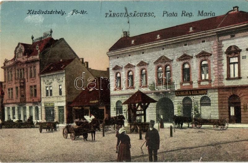 Kézdivásárhely, Targu Secuiesc; Fő tér, Szabó János, Vargha Vilmos üzlete, szekerek, kerekes kút / main square, shops, horse-drawn carriages, well (kis szakadás / small tear)