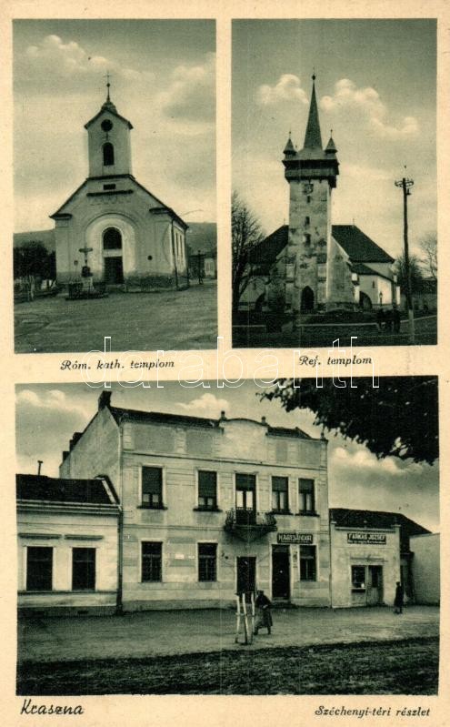 Beschreibung: Kraszna, Crasna; Római katolikus és református templom, Széchenyi tér, Farkas József és Nagy Sándor üzlete / churches, square, shops