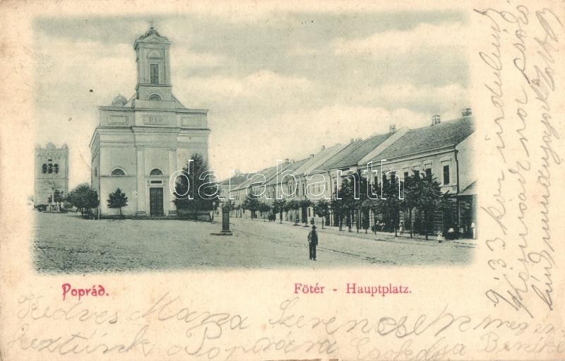 Beschreibung: 1900 Poprád (Tátra, Magas Tátra, Vysoké Tatry); Fő tér, templom / main square, church (apró sarokhiány / tiny corner shortage)