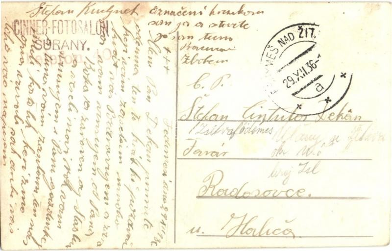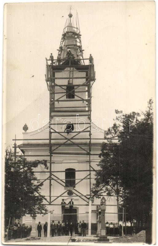 1936 Zsitvafödémes, Fedymes nad Zitavou, Úlany nad Zitavou; Római katolikus templom tatarozás alatt felépítményekkel, Tóth Ferenc építési vállalat munkája / Catholic church under renovation, Frantisek Tóth's construction company. Cinner Fotosalon photo (EK)