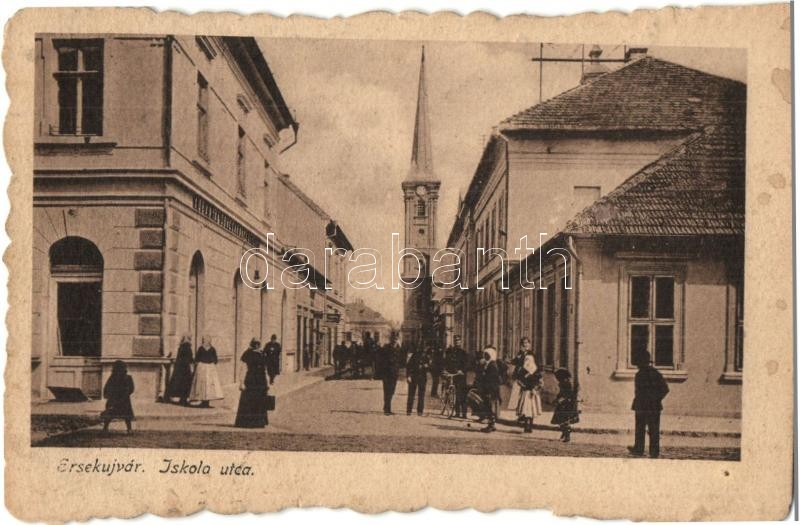 Érsekújvár, Nové Zámky; Iskola utca, sörcsarnok, Római katolikus templom, üzletek, kerékpár. Kiadja Schulcz Testvérek / street view, beer hall, inn, Catholic church, bicycle, shops (fl)