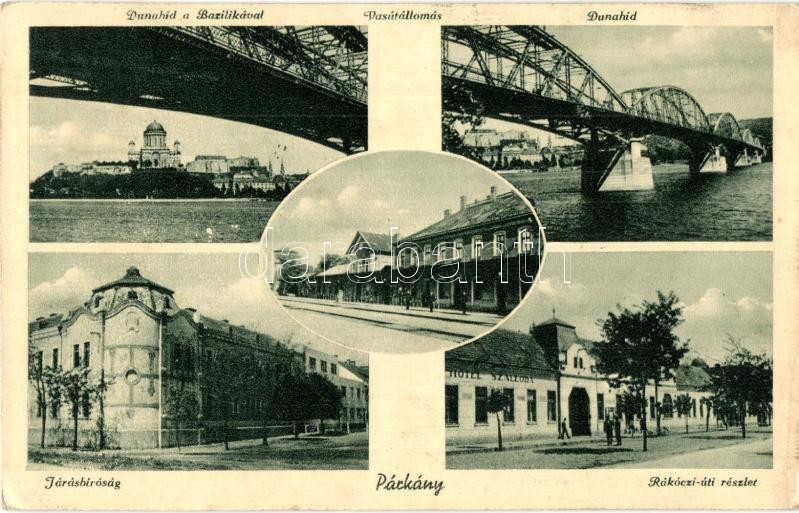 Párkány, Stúrovo; Járásbíróság, Duna híd a Bazilikával, Rákóczi út, szálloda, vasútállomás / district court, Danube bridge with Basilica (in Esztergom), street view, hotel, railway station (EK)