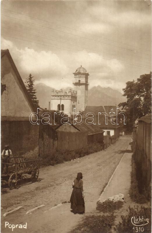 Beschreibung: Poprád (Tátra), Fő utca, templom és Csonka torony / main street, church, tower. Lichtig 1310