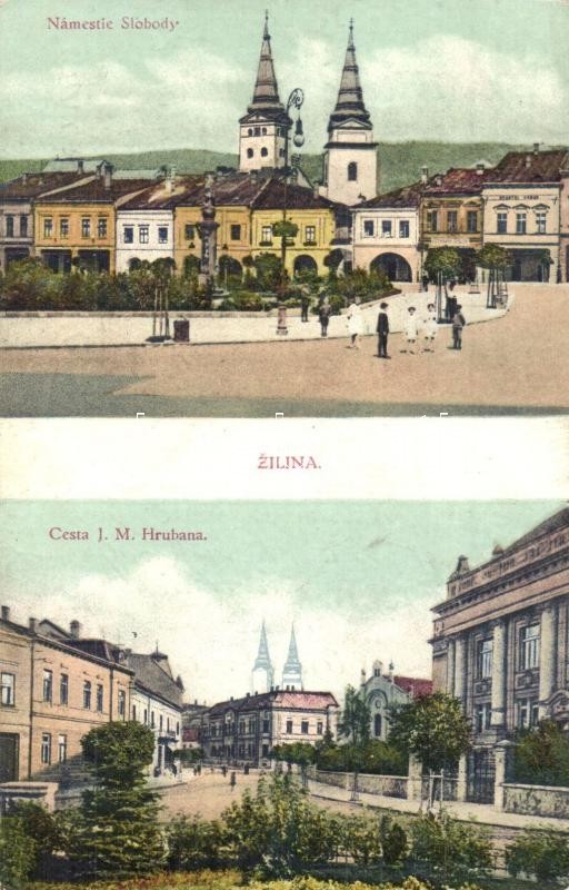 Zsolna, Sillein, Zilina; Námestie Slobody, Cesta J. M. Hurbana / utcakép, Fogyasztási Szövetkezet üzlete, izraelita templom, zsinagóga / street view, cooperative shop, synagogue (EK)