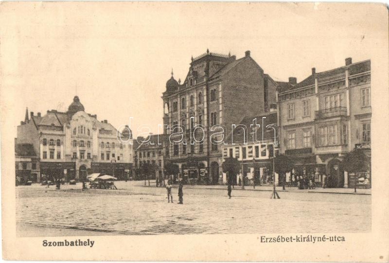 1916 Szombathely, Erzsébet királyné utca, üzletek, piaci árusok (EB) https://www.darabanth.com/de/342-Fernauktion/342.0/Ansichtskarten/Ungarn~2000004/1916-Szombathely-Erzsebet-kiralyne-utca-uzletek-piaci-arusok-EB~II1929433