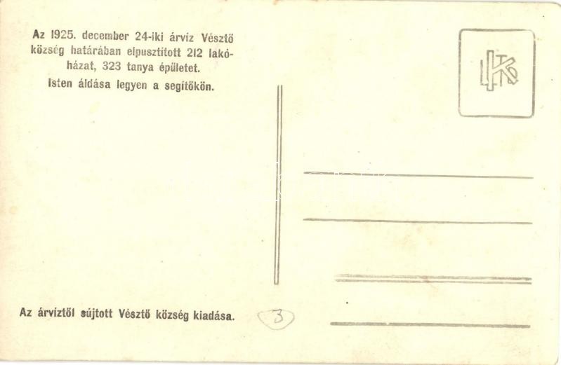 Beschreibung: 1925 Vésztő, december 24-iki árvíz Vésztő község határában elpusztított 212 lakóházat, 323 tanya épületet. Az árvíztől sújtott Vésztő község kiadása