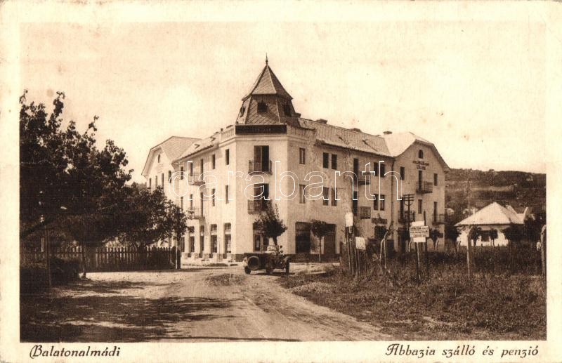 Balatonalmádi, Hotel Abbazia szálloda és penzió, automobil (EK) https://www.darabanth.com/de/342-Fernauktion/342.0/Ansichtskarten/Ungarn~2000004/Balatonalmadi-Hotel-Abbazia-szalloda-es-penzio-automobil-EK~II1925486