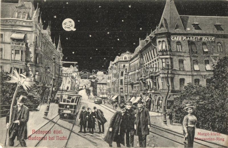 Budapest II. Margit körút éjjel, Café Margit Park kávéház, villamos, háttérben a Rózsadomb. Humoros részeg montázs (kis sarokhiány / small corner shortage)