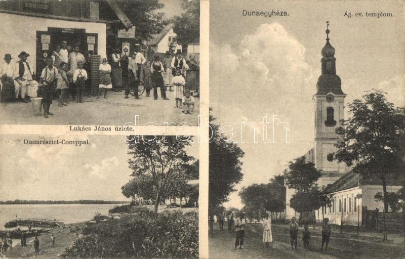 Beschreibung: Dunaegyháza, Evangélikus templom, Duna rész komppal, Lukács János üzlete