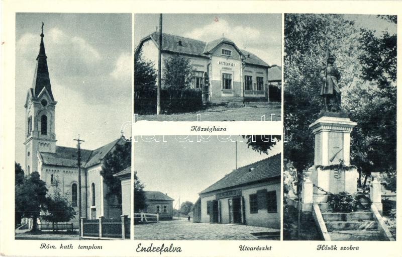 Beschreibung: Endrefalva, Római katolikus templom, Községháza, Hősök szobra, emlékmű, utcakép, üzlet