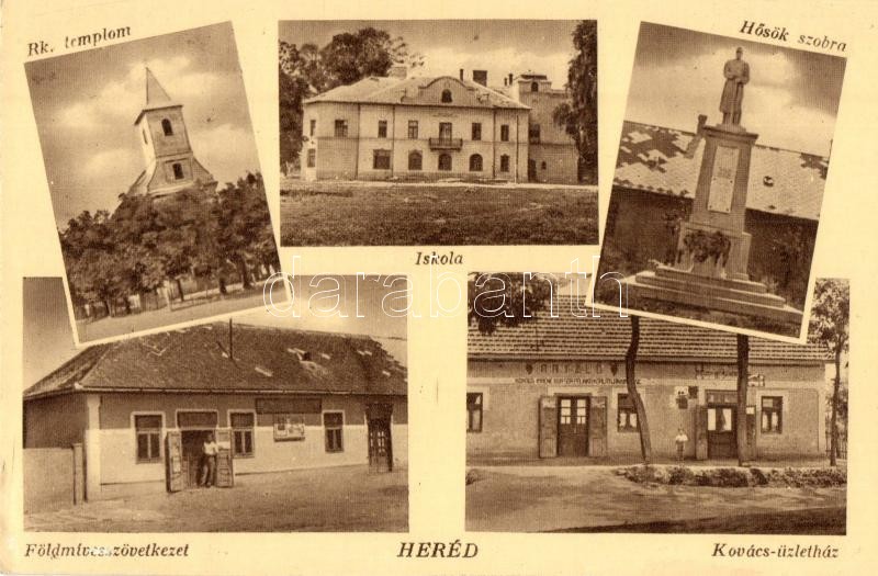 Heréd, Római katolikus templom, Iskola, Hősök szobra, Földművesszövetk... https://www.darabanth.com/de/342-Fernauktion/342.0/Ansichtskarten/Ungarn~2000004/Hered-Romai-katolikus-templom-Iskola-Hosok-szobra-Foldmuvesszovetkezet-uzlete-Kovacs-C3~II1926026