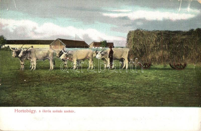 Hortobágy, 6 ökrös szénás szekér https://www.darabanth.com/de/342-Fernauktion/342.0/Ansichtskarten/Ungarn~2000004/Hortobagy-6-okros-szenas-szeker~II1929302
