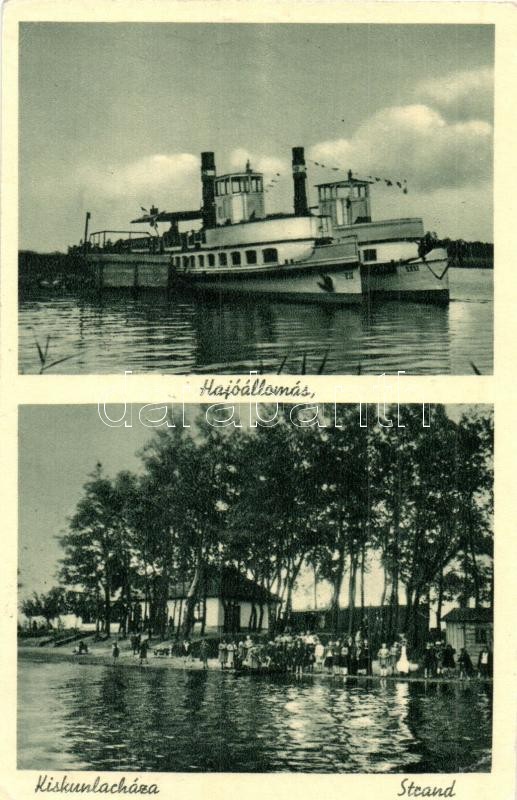 Beschreibung: Kiskunlacháza, Hajóállomás, gőzhajó, Strand. Özv. Puhi Sándorné kiadása (EK)