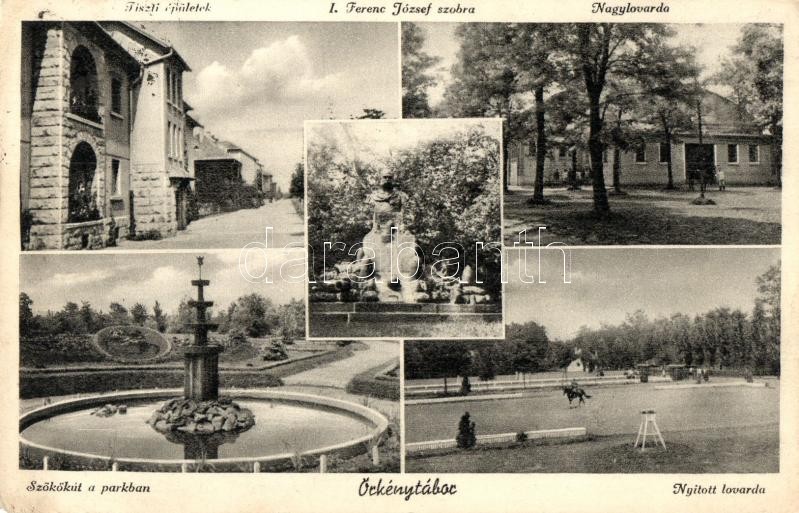 Örkénytábor (Táborfalva), Tiszti épületek, I. Ferenc József szobor, nagy lovarda, Szökőkút a parkban, nyitott lovarda (kis sarokhiány / small corner shortage)