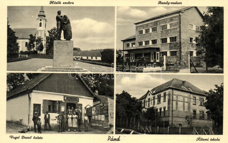 Beschreibung: Pánd, Hősök szobra, Bundy malom, Állami iskola, Vogel Dezső üzlete és saját kiadása