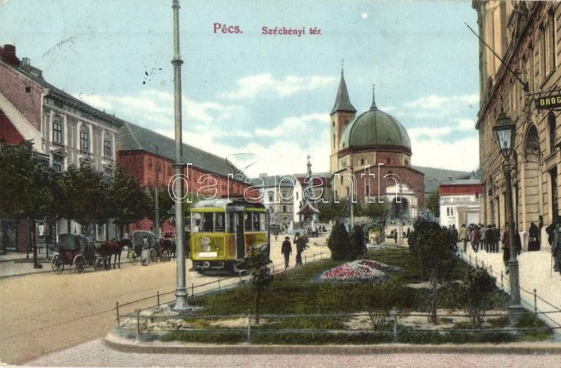 Pécs, Széchenyi tér, villamos, drogéria. Blancz József kiadása https://www.darabanth.com/de/342-Fernauktion/342.0/Ansichtskarten/Ungarn~2000004/Pecs-Szechenyi-ter-villamos-drogeria-Blancz-Jozsef-kiadasa~II1645566