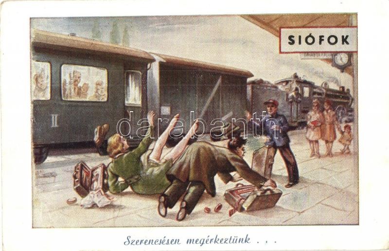 Beschreibung: Siófok, Szerencsésen megérkeztünk! humoros lap a vasútállomásról, vonat