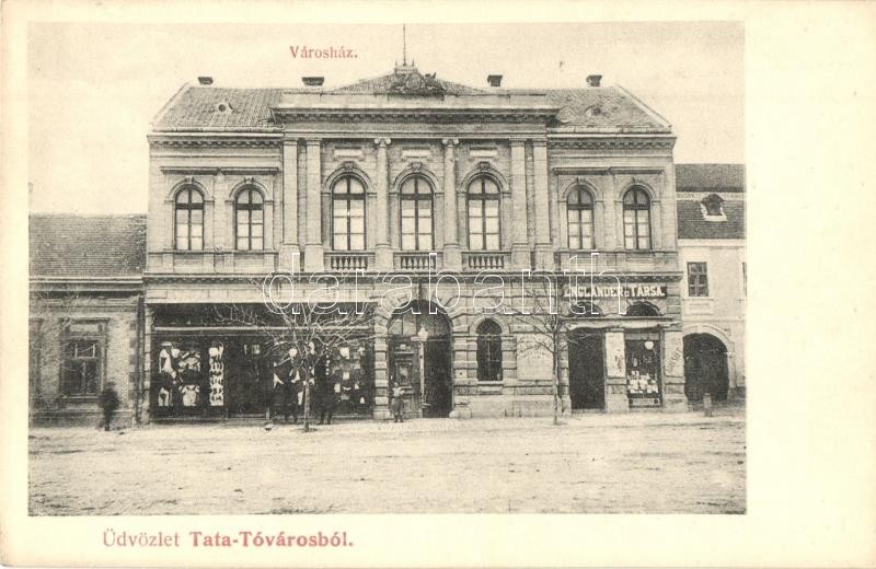Beschreibung: Tata, Tata-Tóváros; Városháza, Strausz Jakab és Fia üzlete, Engländer és Társa üzlete és saját kiadása