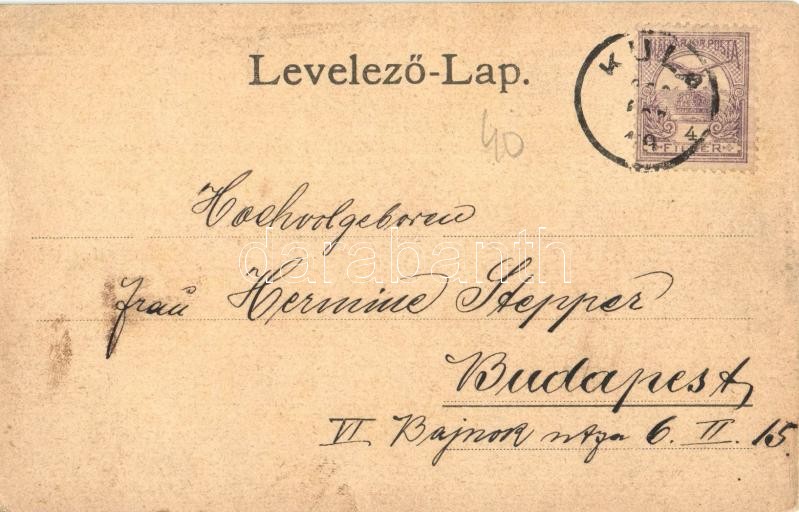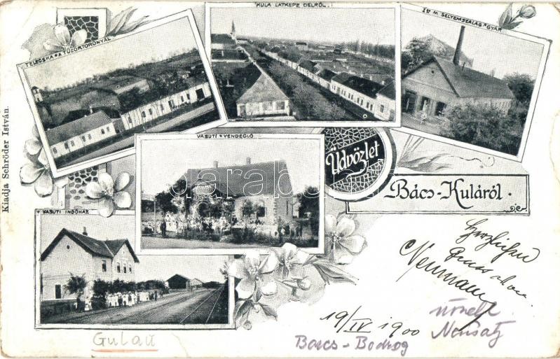 1900 Kúla, Bács-Kula, Kula; Telecska a tűztoronnyal, látkép délről, Első magyar selyemszalag gyár, vasúti vendéglő, étterem, vasúti indóház, vasútállomás. Kiadja Schröder István / general view, railway restaurant, railway station, spinning mill. Art Nouveau, floral (EK)