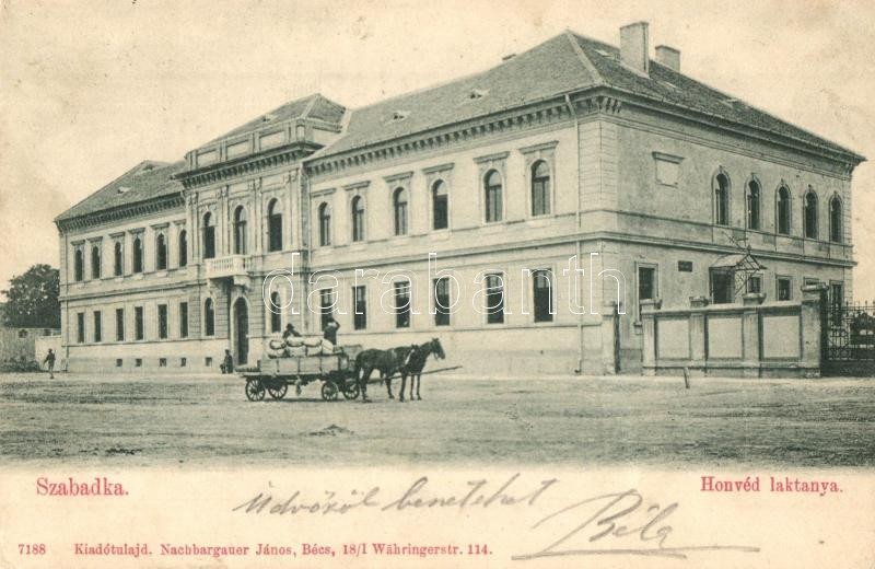 Beschreibung: 1900 Szabadka, Subotica; Honvéd laktanya, szekér. Kiadja Nachbargauer János 7188. / K.u.K. military barracks, horse-drawn carriage (EK)