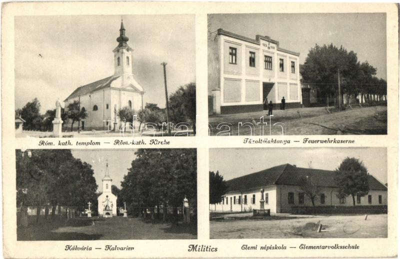 Militics, Srpski Miletic; Röm. kath. Kirche, Feuerwehrkaserne, Kalvarien, Elementarvolksschule / Római katolikus templom, Kálvária, Elemi iskola, Tűzoltó laktanya / church, calvary, elementary school, firefighter barracks (EK)