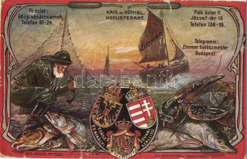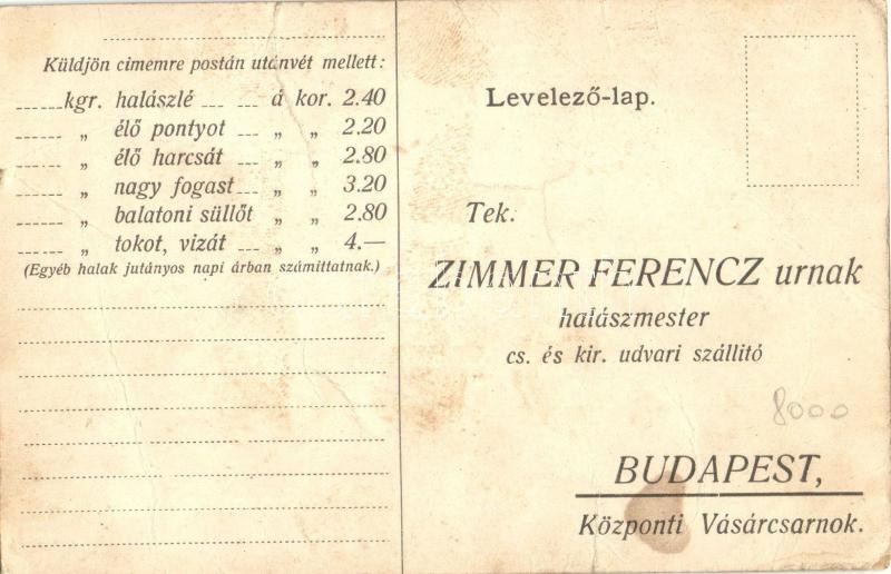Zimmer Ferenc halászmester, cs. és kir. udvari szállító. Budapest, Központi Vásárcsarnok. Megrendelőlap és árlista a hátoldalon / Hungarian fishing master's advertisement. Order form and price list on the backside (fa)