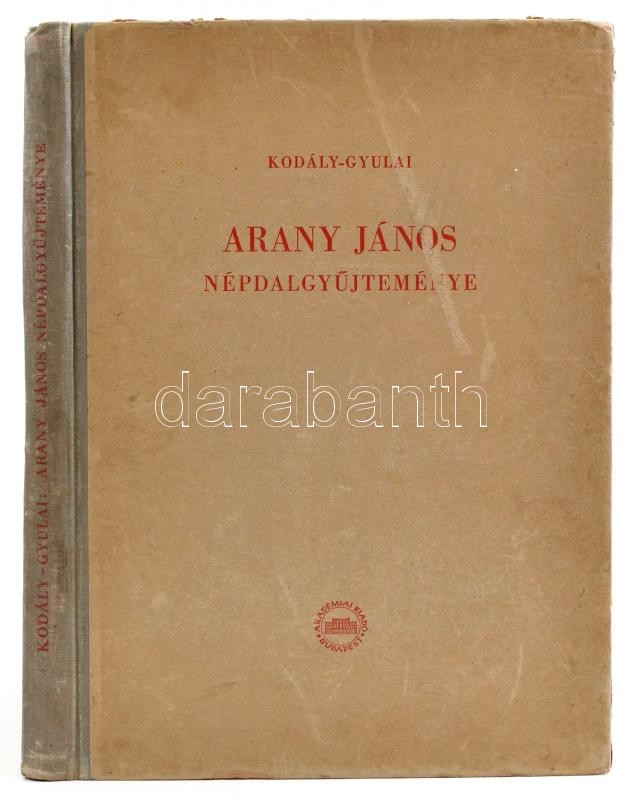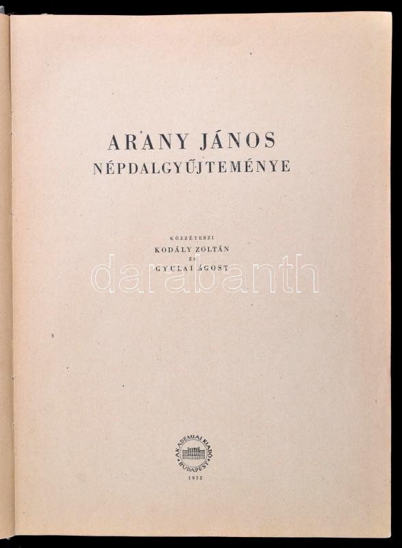 Kodály Zoltán - Gyulai Ágost: Arany János népdalgyűjteménye. Bp., 1952, Akadémiai Kiadó. Kiadói félvászon kötés, kopottas állapotban, tulajdonosi bejegyzéssel, belül a gerincnél kissé levált.