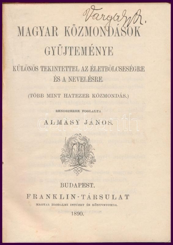 Magyar közmondások gyűjteménye. Különös tekintettel az életbölcsességre és a nevelésre. (Több, mint hatezer közmondás.) Rendszerbe foglalta: Almásy János. Bp.,1890, Franklin, 379+5 p. Átkötött félvászon-kötés, foltos gerinccel.