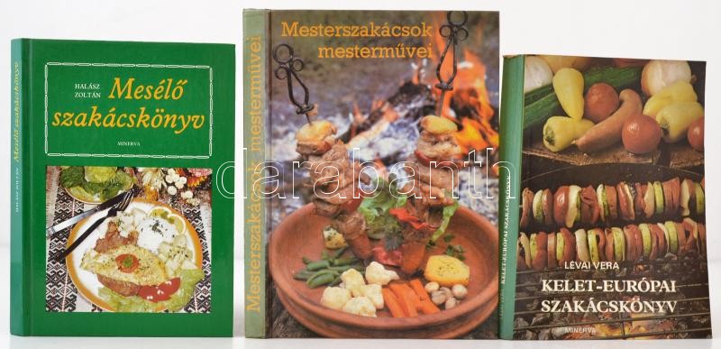 Vegyes könyvtétel, 3 db: Lévai Vera: Kelet-Európai szakácskönyv. Bp.,1983, München. Kiadói papírkötés. Halász Zoltán: Mesélő szakácskönyv. Bp.,1985, Minerva. Kiadói kartonált papírkötés. Mesterszakácsok mesterművei. Szerk.: Berek János. Bp., 1988, Közgazdasági és Jogi-Primo. Kiadói kartonált papírkötés.
