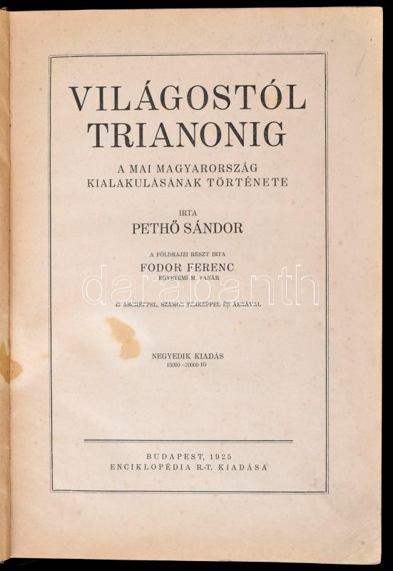 Pethő Sándor: Világostól Trianonig. A mai Magyarország kialakulásának története. A földrajzi részt írta Fodor Ferenc. Bp., 1925, Enciklopédia Rt., VIII+324+4 p. Negyedik kiadás. Kiadói egészvászon-kötés, kopott borítóval.
