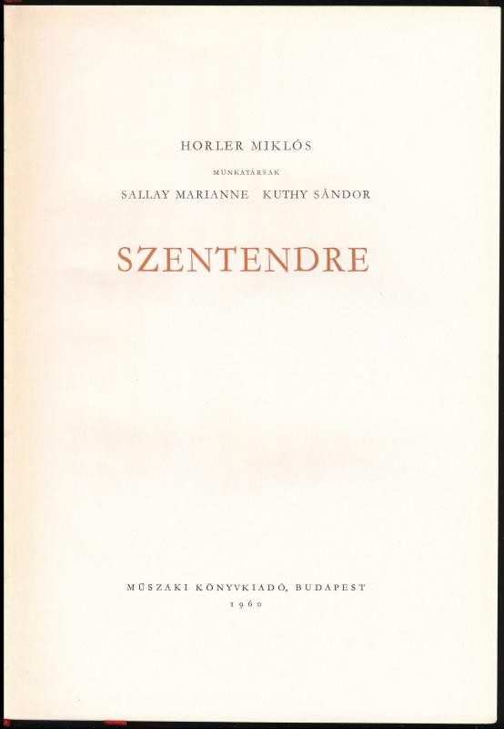Horler Miklós-Sallay Marianne-Kuthy Sándor: Szentendre. Városképek-Műemlékek. Bp., 1960, Műszaki. Fekete-fehér fotókkal illusztrált. Kiadói egészvászon kötés, kiadói kissé szakadt papír védőborítóval, jó állapotban.