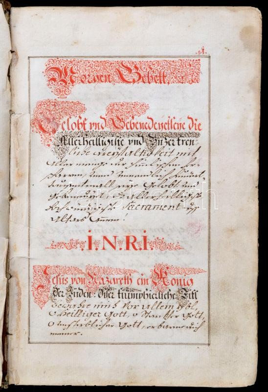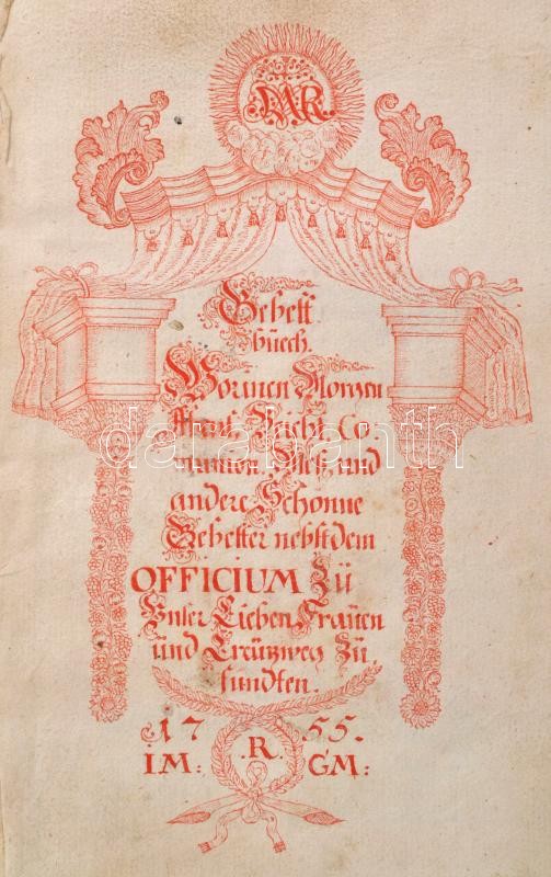 cca 1753-1755 Német nyelvű, kézzel írt imádságos könyv, officium. Rajzolt piros színű címlapokkal, piros színű fejezet címekkel, 139 sz. lev.+2+21 sztl. lev. Korabeli aranyozott egészbőr-kötésben, kopott borítóval, az utolsó lapon ceruzás firkával.