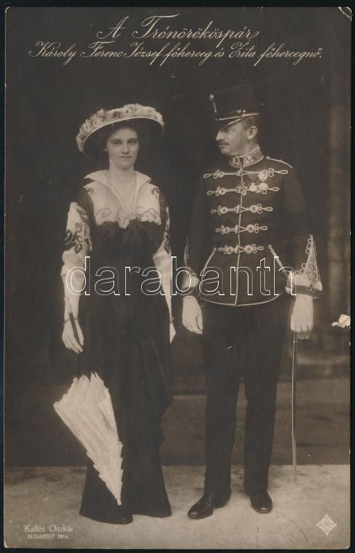 1914 Bp., IV. Károly (1887-1912) még trónörökösként feleségével Zita királynéval, Kallós Oszkár felvétele, megírt fotólap, egyik sarkán kis törésnyom, 13,5×8,5 cm